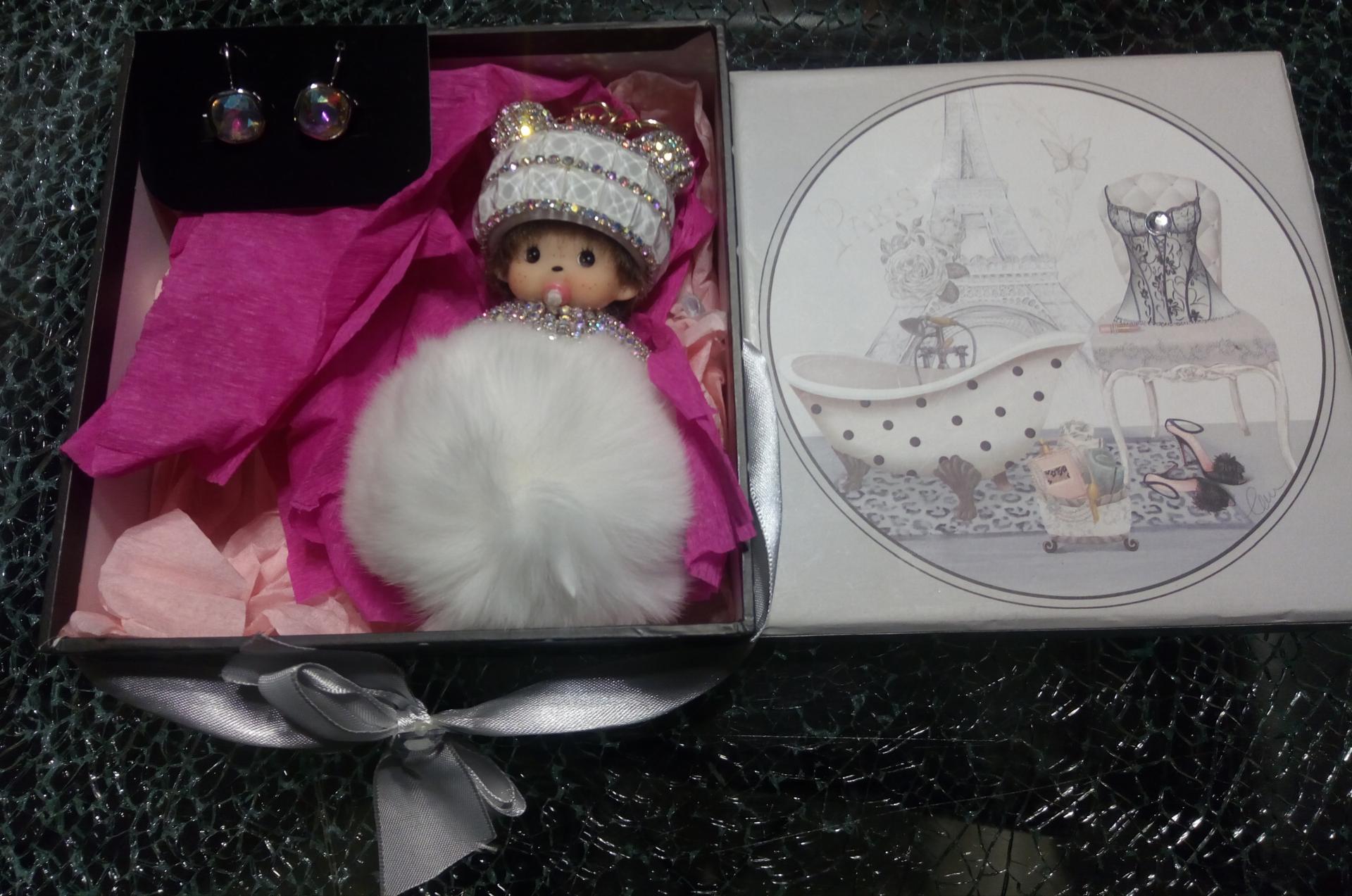 Coffret cadeaux style glamour, ruban- strass,boucles d'oreilles carré strass et kiki pompon blanc