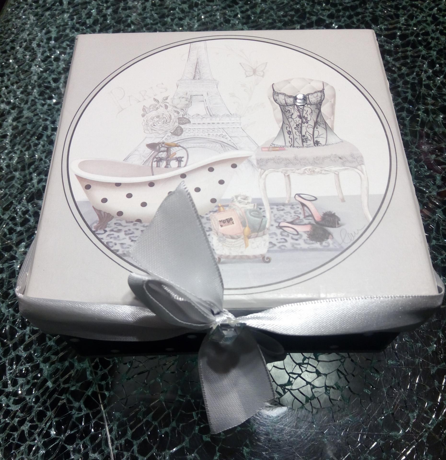 Boîte carton carrée style glamour, son ruban gris et strass
