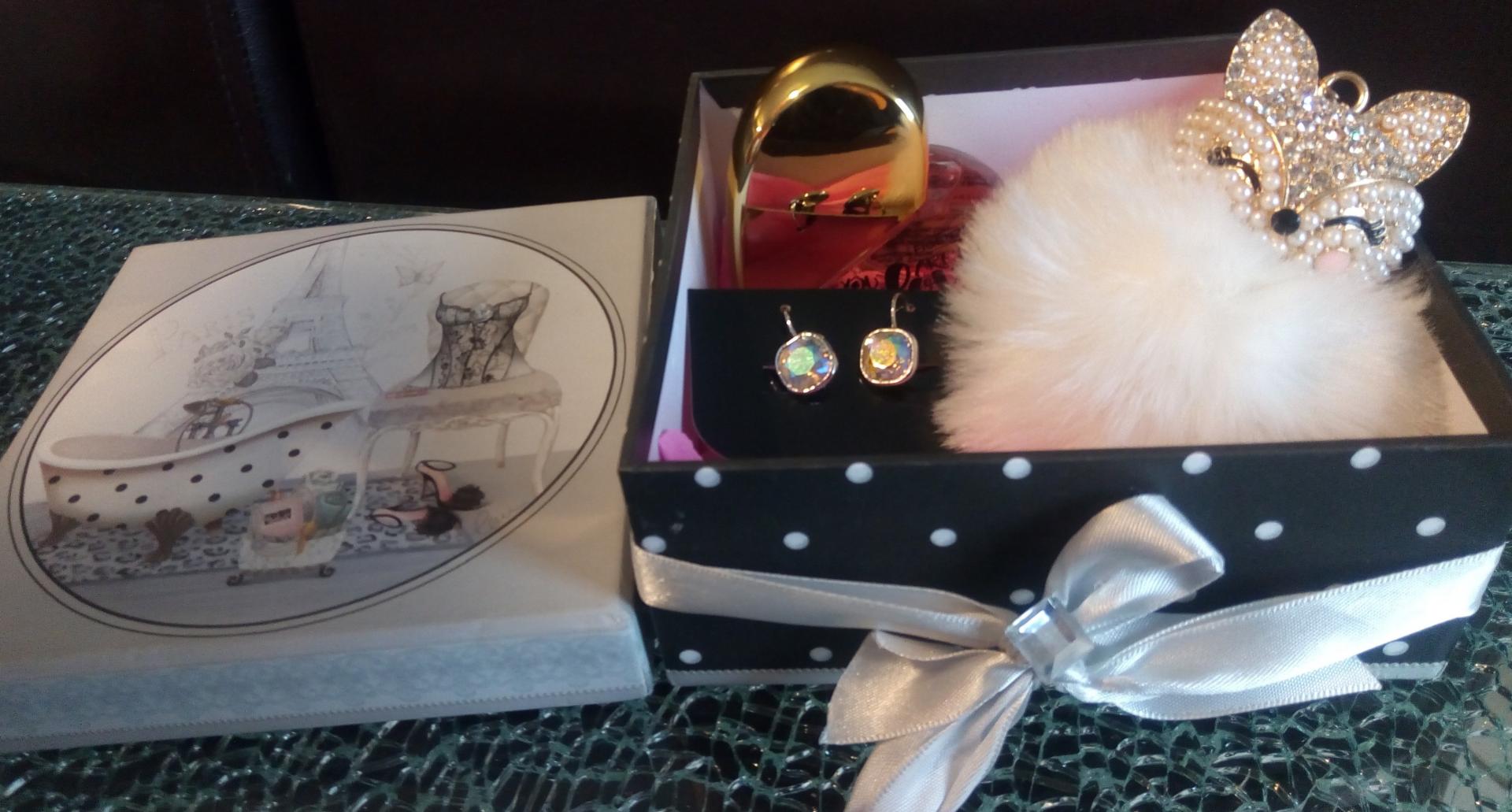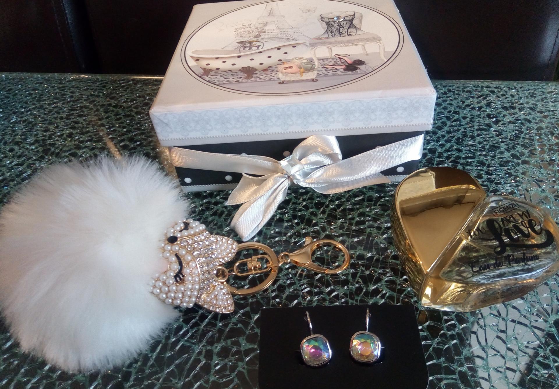 Coffret cadeaux style glamour, ruban- strass, boucles d'oreilles, renard strass et parfum cœur.