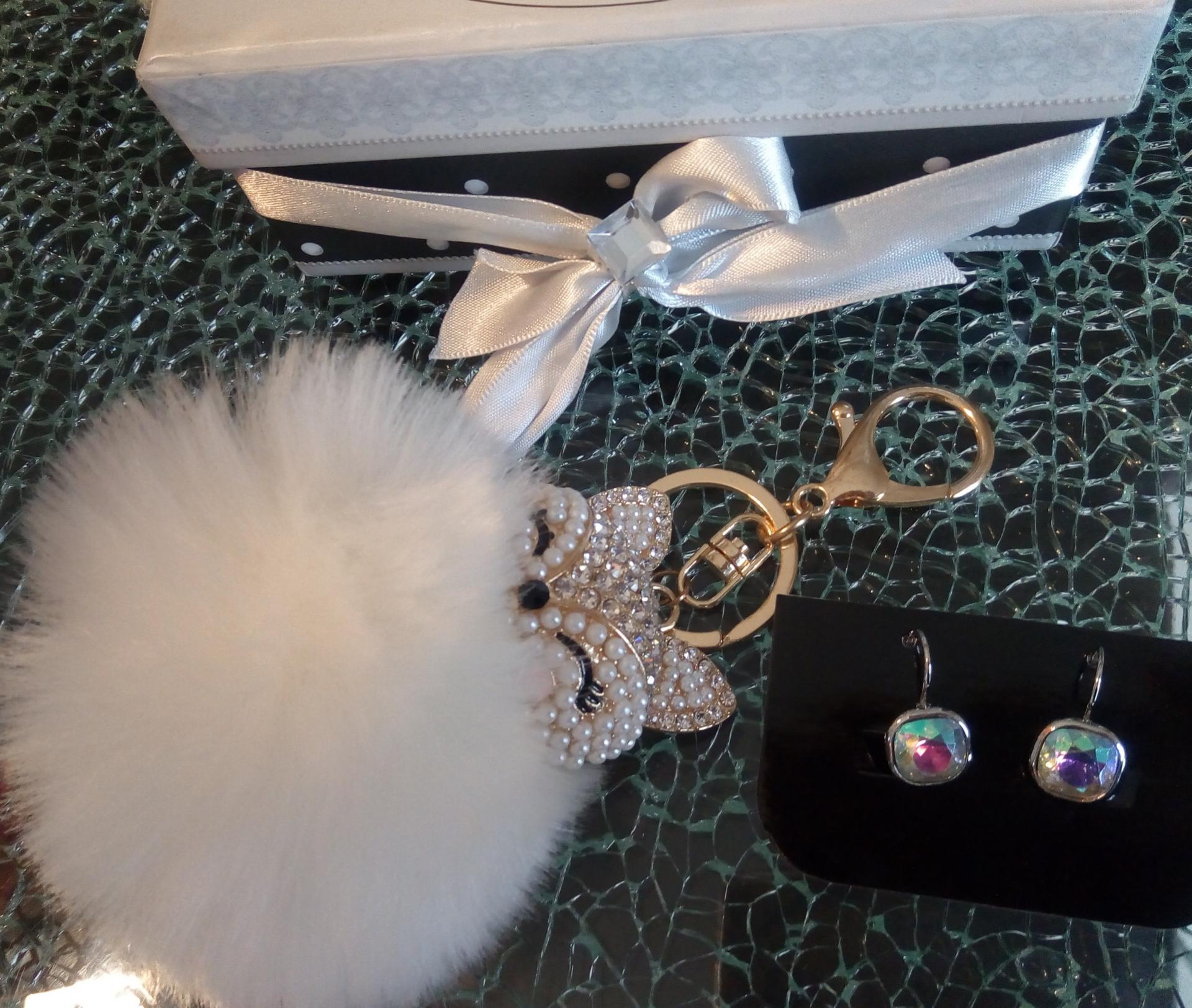comprenant des boucles d'oreille carré strass blanc reflets AB, renard strass sur pompon blanc et eau de parfum coeur doré 33ml.