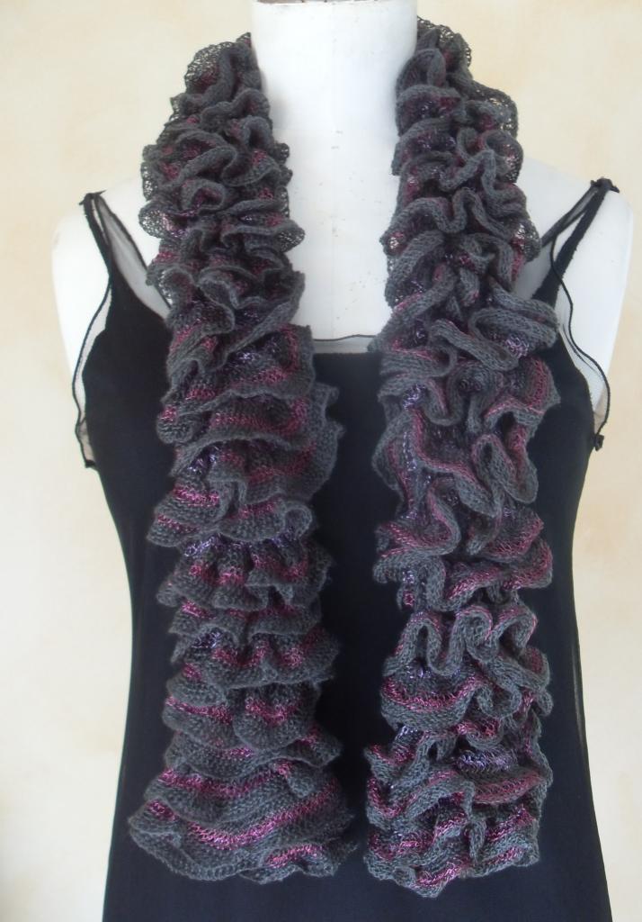 comprenant une écharpe frou-frou grise, fuscia et mauve,