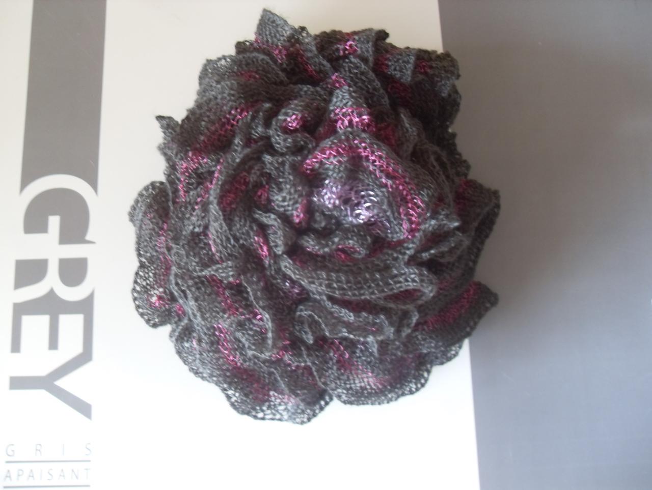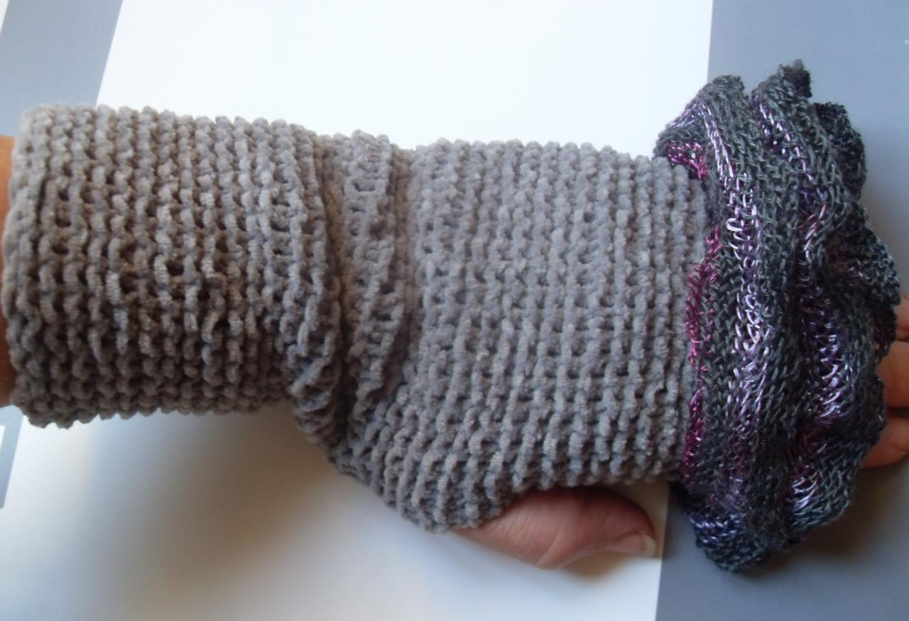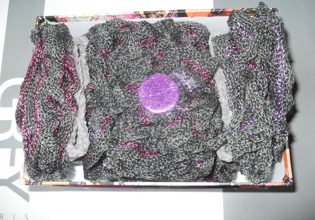 Coffret cadeaux style vintage son écharpe frou-frou grise fushia mauve mitaine tricotées main. anniversaire cadeau Noël idée cadeau; st valentin