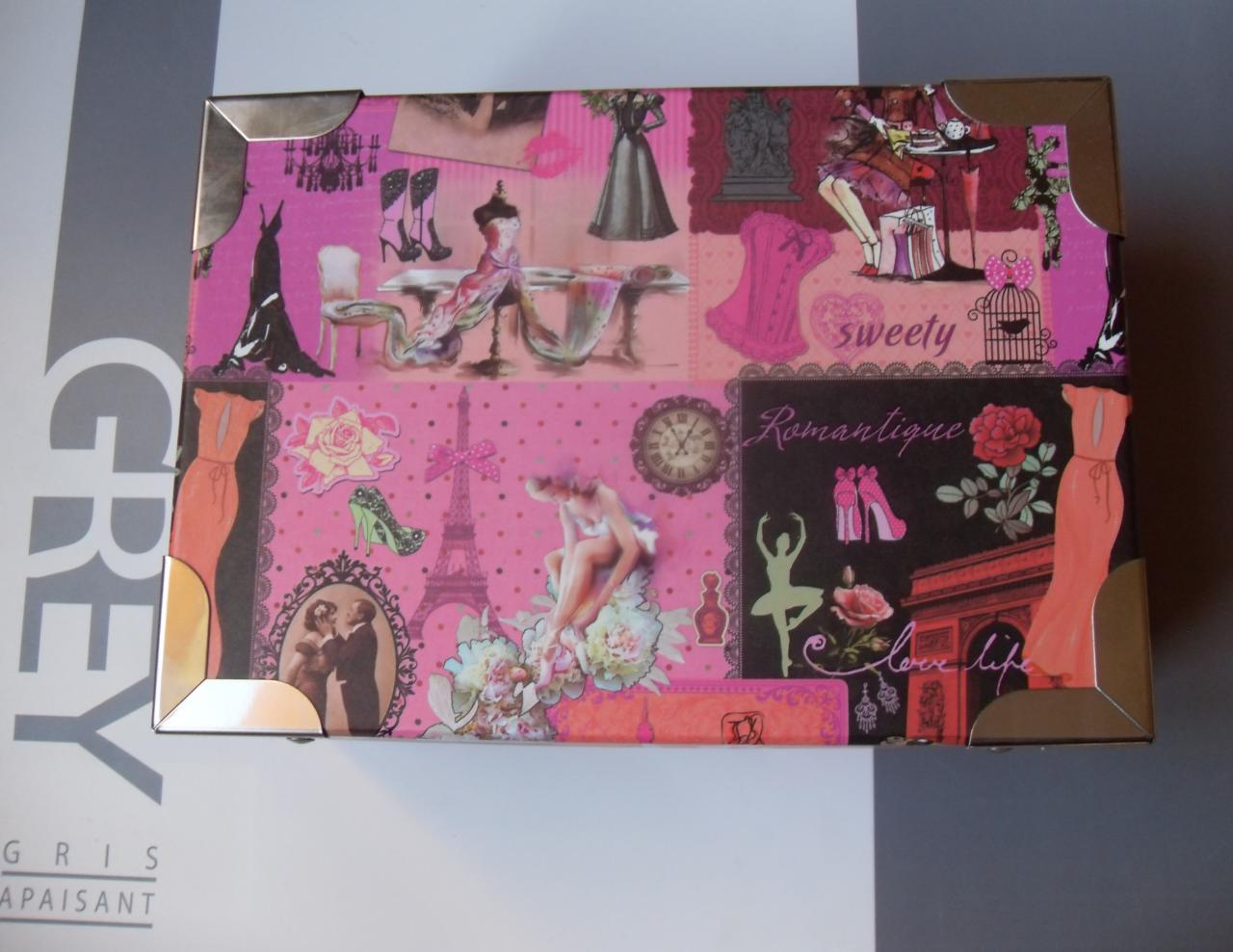 Boîte carton, marron et rose et motifs style vintage avec anses métal.