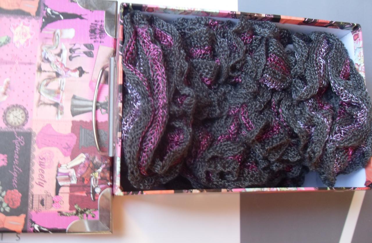 Coffret cadeaux style vintage, son écharpe frou-frou grise-fushia et mauve et ses mitaines, tricotées main.