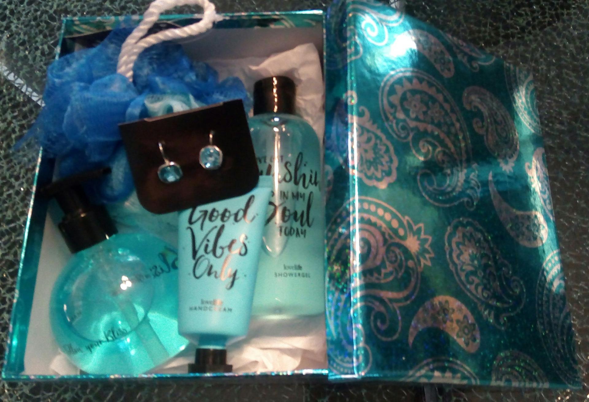 Coffret cadeaux turquoise, produits, boucles d'oreilles et kiki.