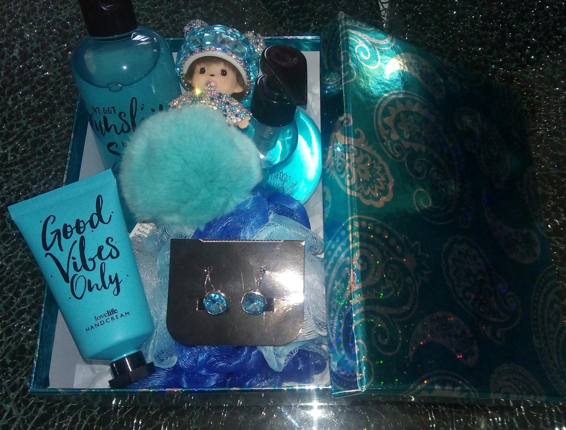 Coffret cadeaux turquoise, produits cosmétiques, boucles d'oreilles et kiki strass.