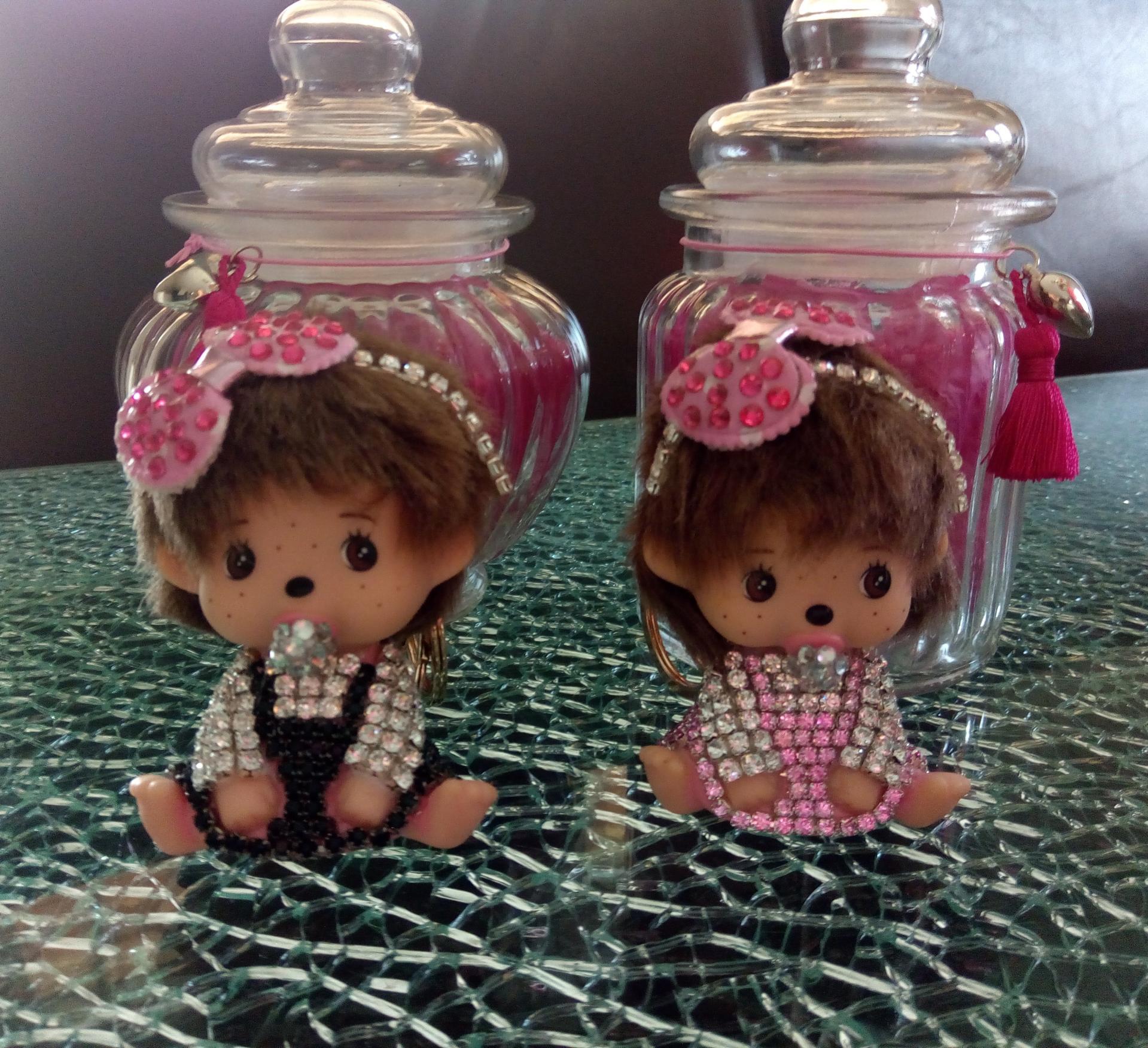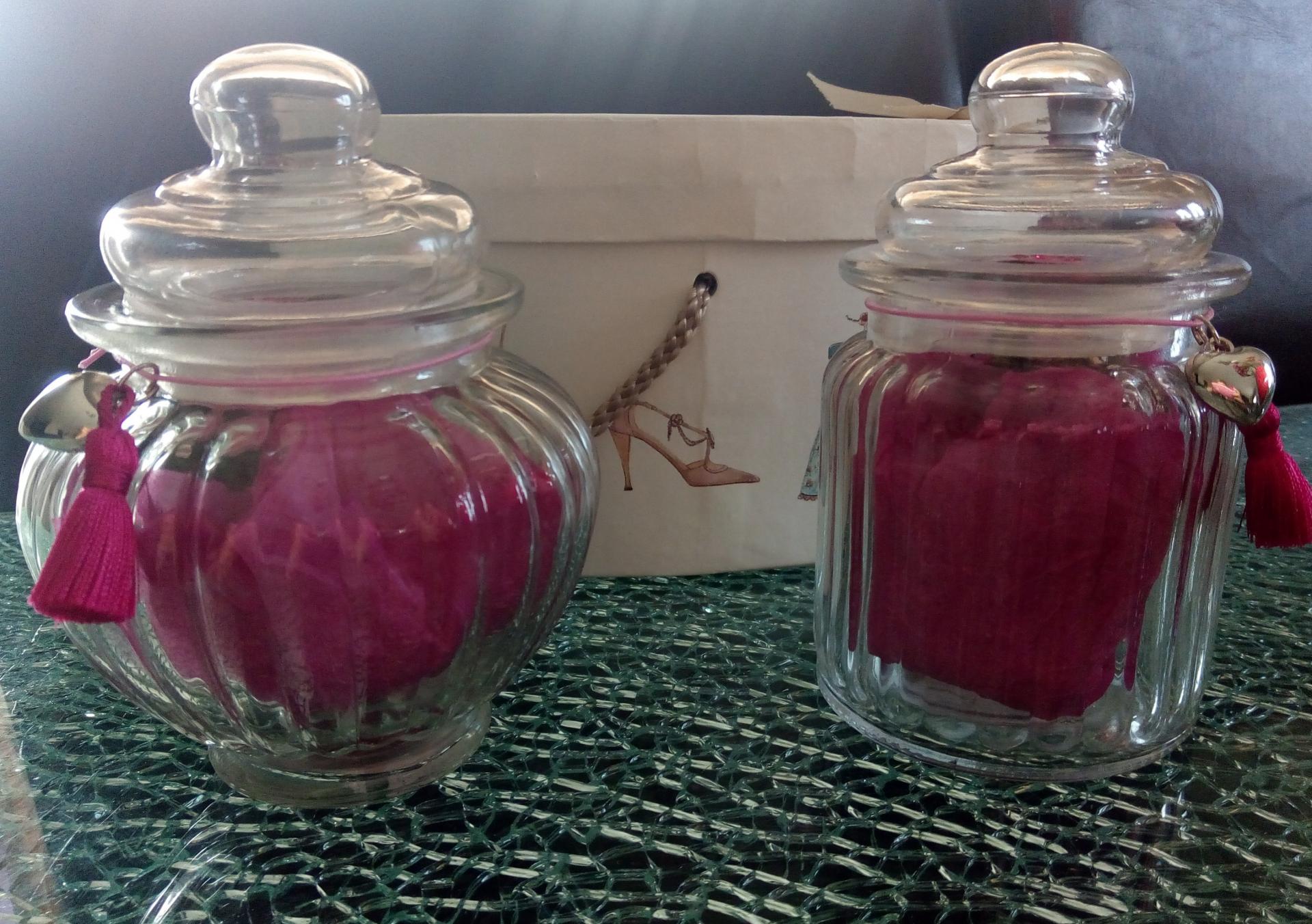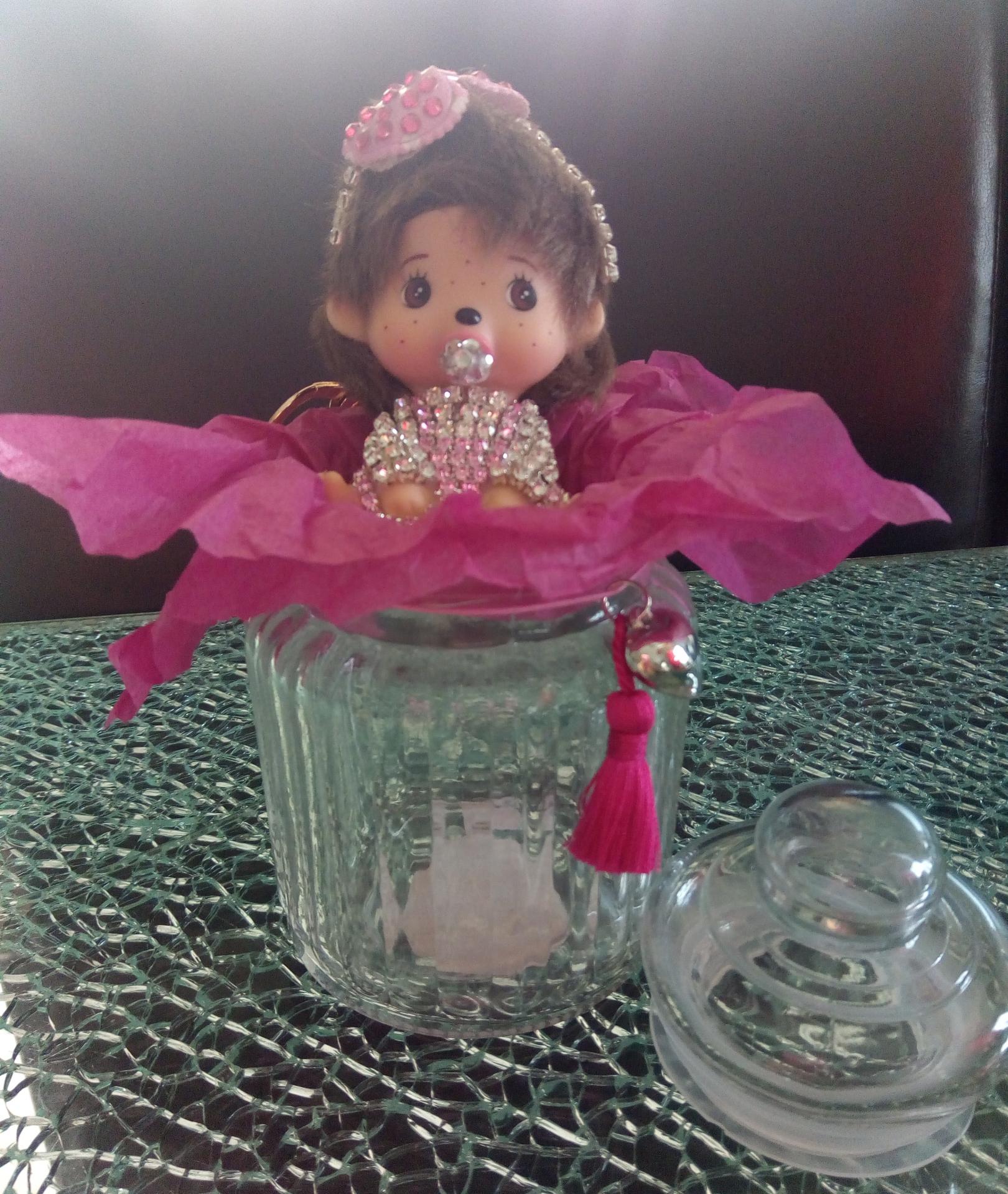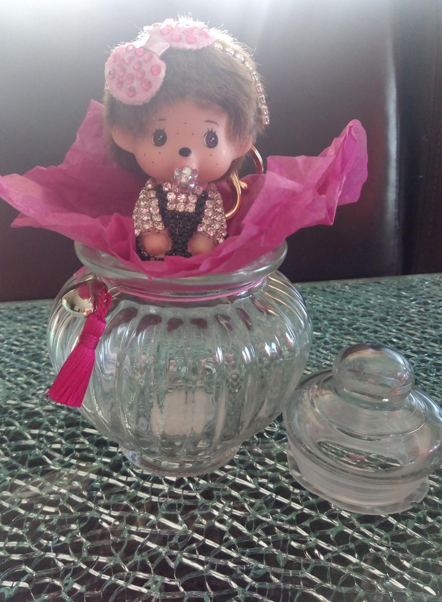 une bonbonnière en verre décorée d un pompon rose et d un coeur,