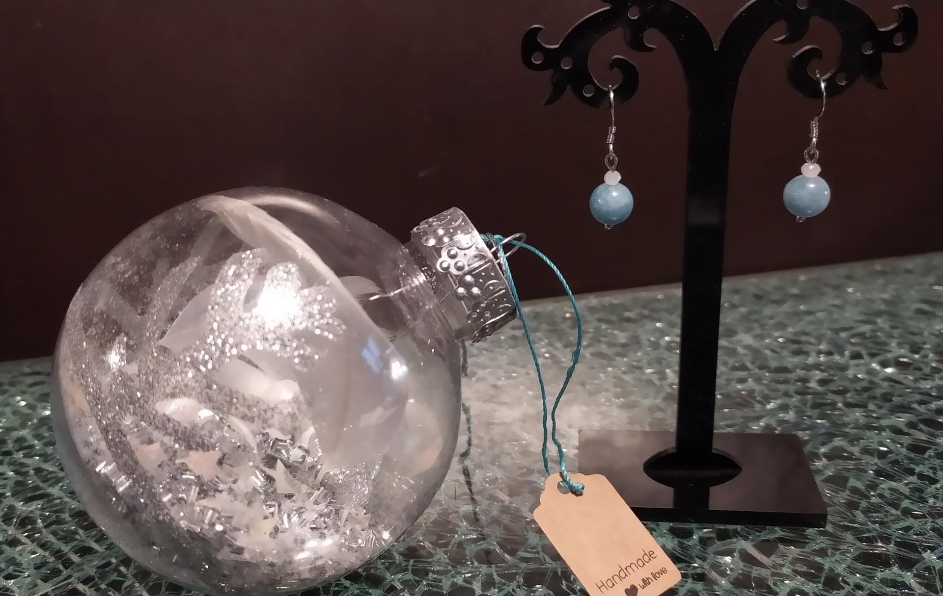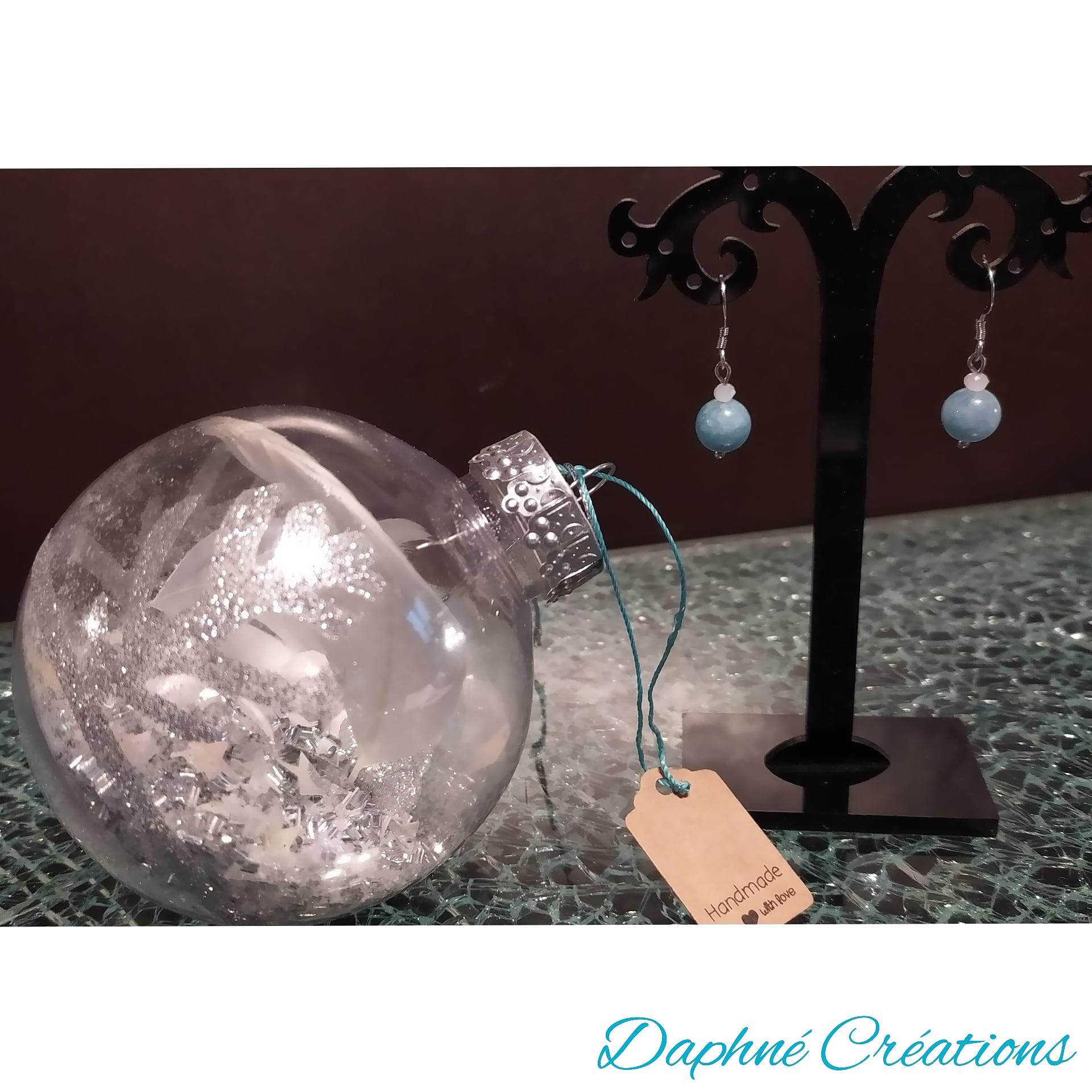 Boule de Noël surprise, argent et ses boucles d'oreilles agates bleues.