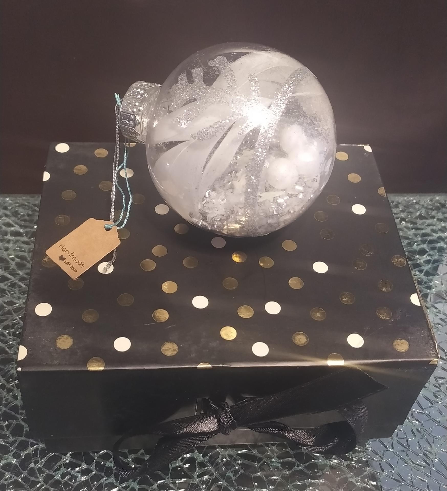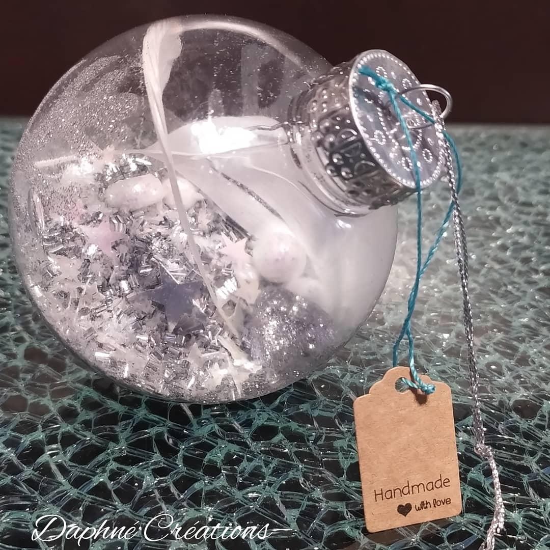 Une boule de Noël dans les tons argentés avec son bijou-surprise caché à l'intérieur! Une surprise à offrir et à suspendre dans le sapin.