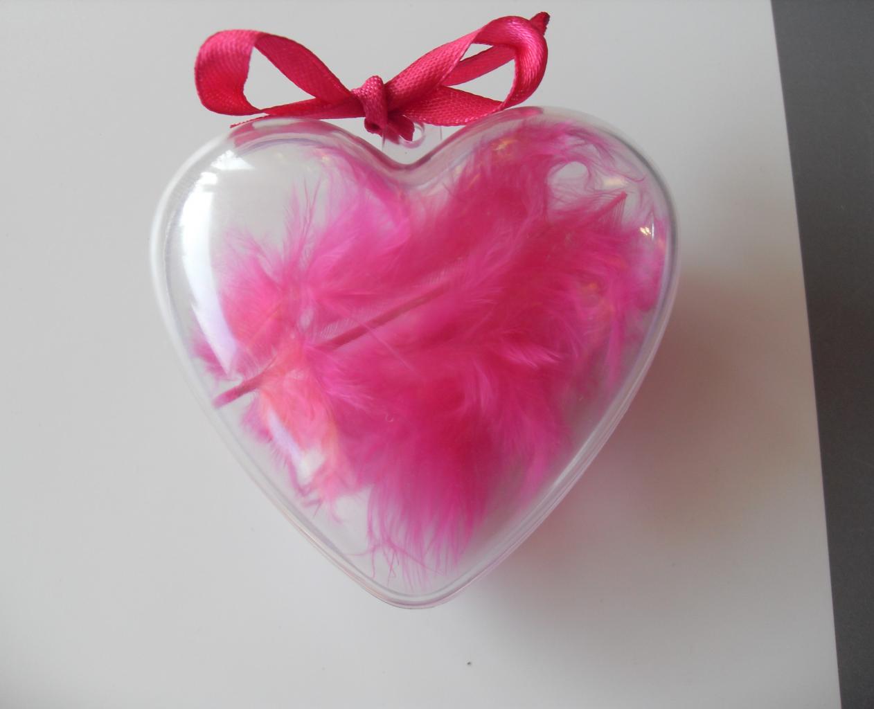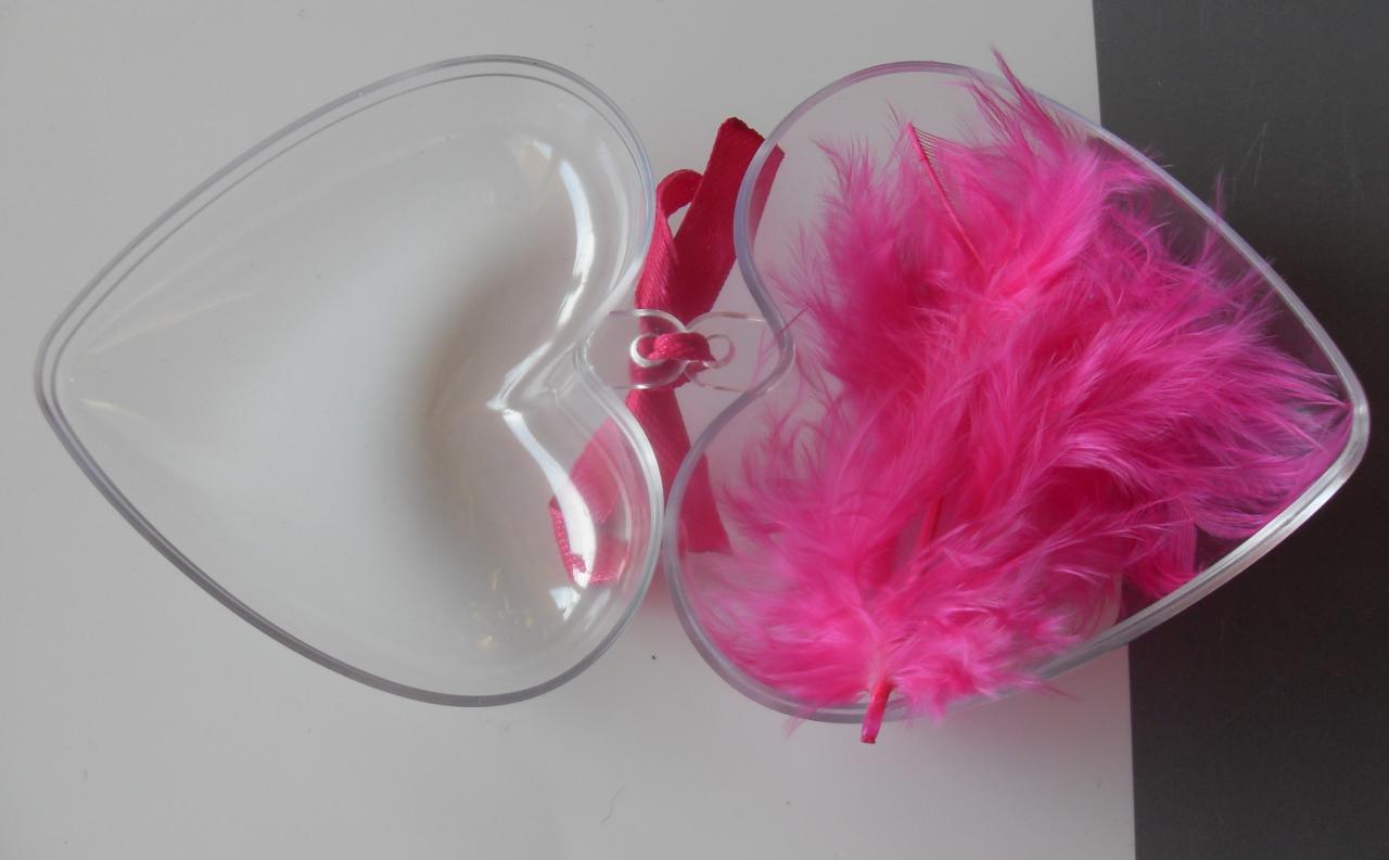 Boîte coeur, transparente avec sa plume rose fuschia et son ruban.
