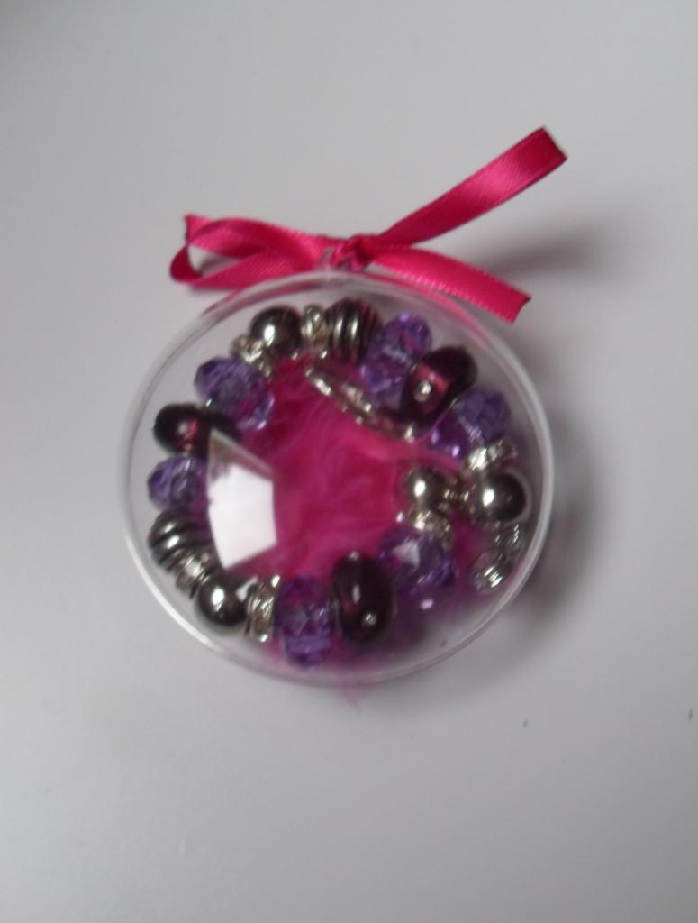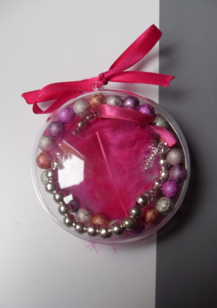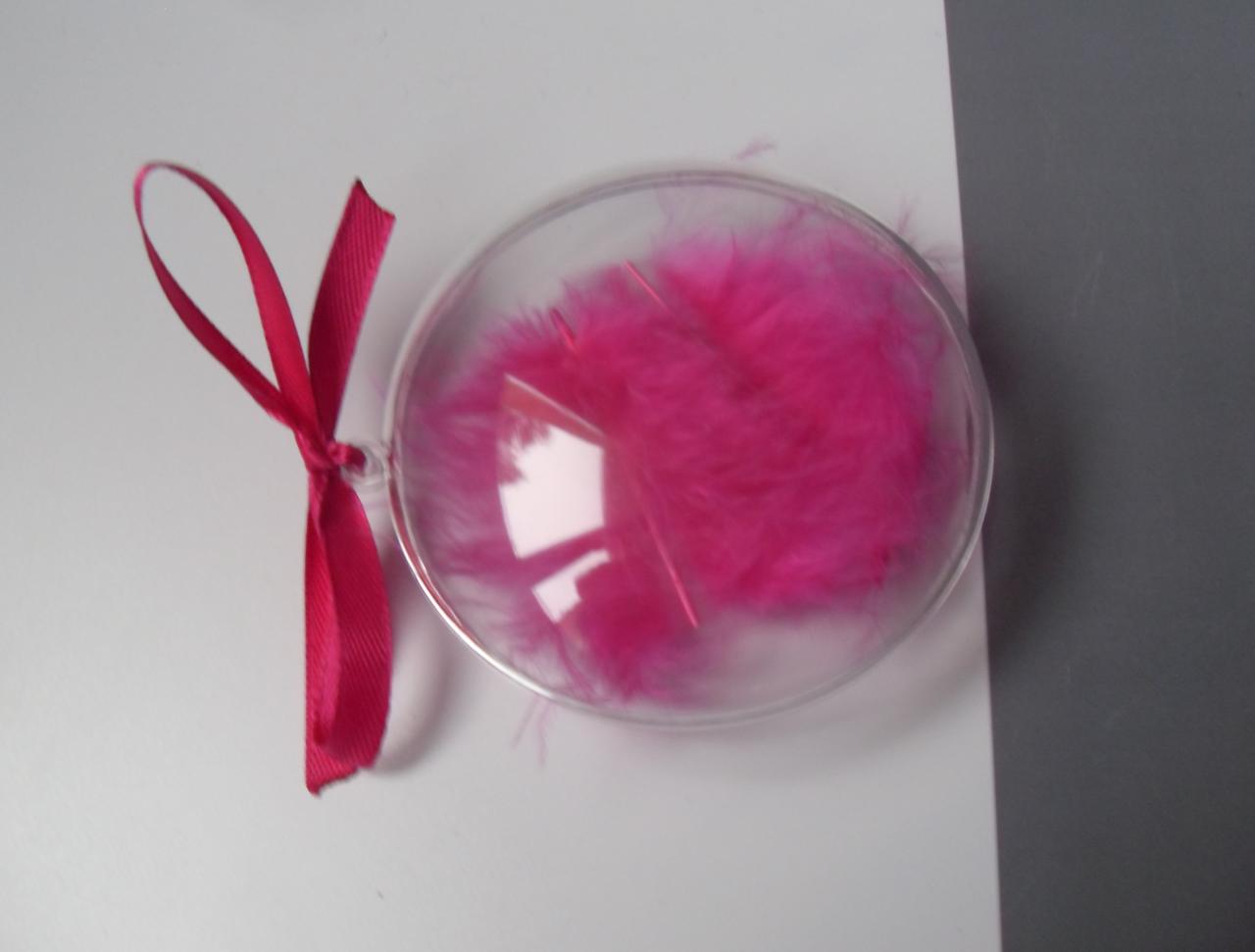 Boîte ronde, transparente avec sa plume rose fuschia et son ruban.