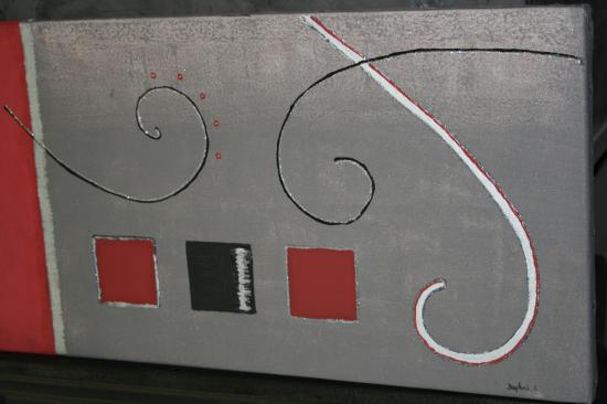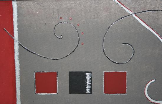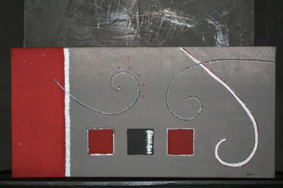 Tableau rectangle sur toile, bordeaux, noir et gris avec ses carrés et ses arabesques.