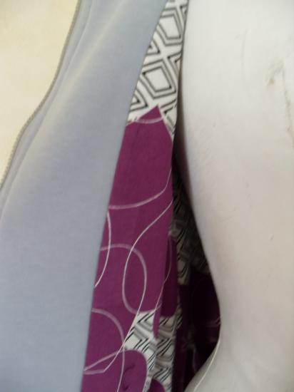 Doublure imprimée violette et capuche doublée en tule brodé de paillettes.