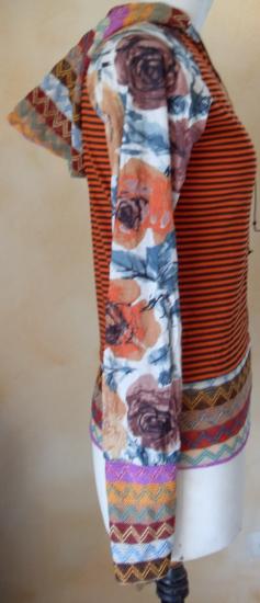 Gilet orange rayé et manches longues fleuries, capuche avec liens. Gilet zippé avec poche zipée sur le côté gauche.