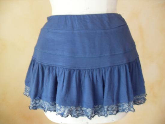Jupe bleue,courte à volants et empiecement de tissu fleuri. 2 petits boutons sur le côté gauche.
