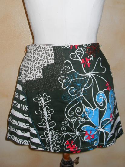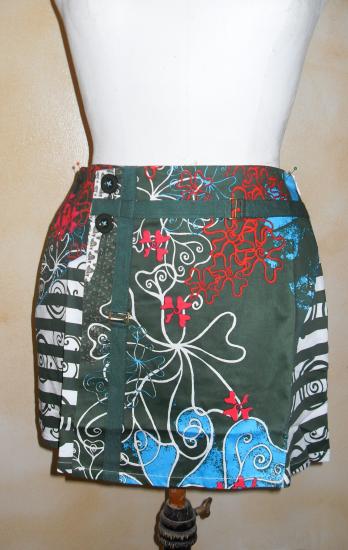 Jupe courte verte et imprimés, fermeture éclair invisible sur le côté gauche. Deux boutons et biais sur le devant.