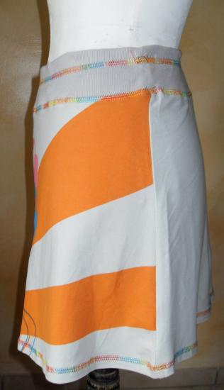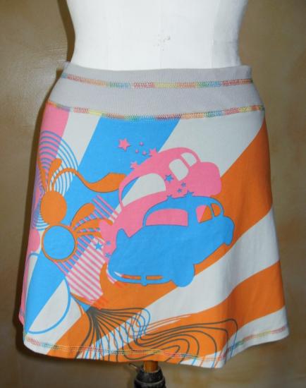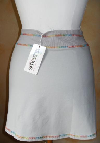 Jupe courte grise avec dessins colorés.