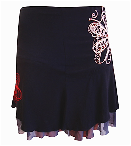 Jupe noire et motifs brodés blanc et rouge, sur un voile gris.