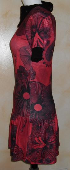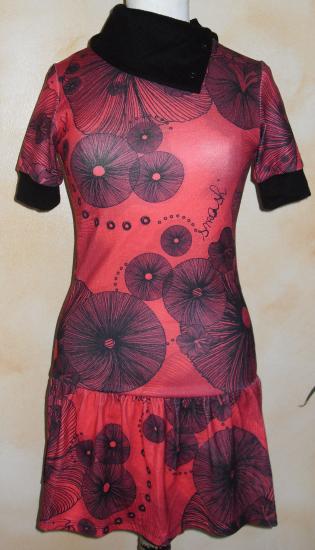 Robe rose et motifs noirs, manches courtes, col boutonné noir, à porter retombant ou en col roulé.