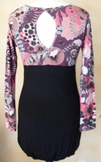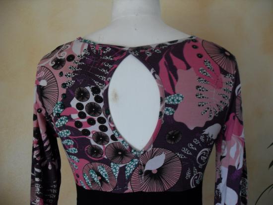 Oh ! J'aime bien la finition boule en bas de la robe, c'est original ! Le choix du tissu est très judicieux, l'imprimé est joli et ressort bien, la découpe dans le dos en fait une robe originale et elle a l'air très confortable à porter ! :)
