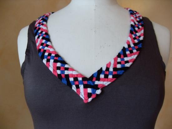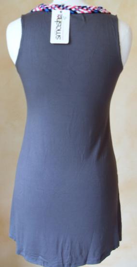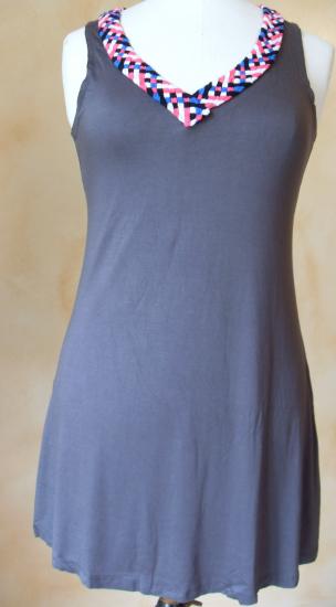 Robe-tunique grise forme bretelle, encolure en V multicouleurs.