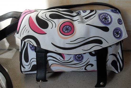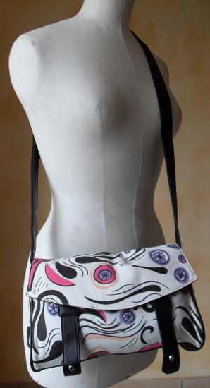 Sac bandoulière blanc et multicolore avec rabat. Intérieur doublé avec une poche zippée. Fermeture par pression aimantée.