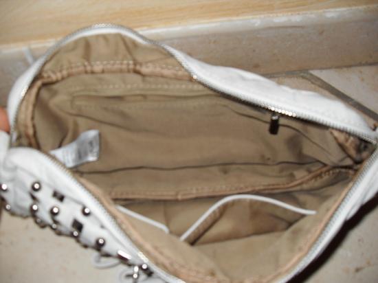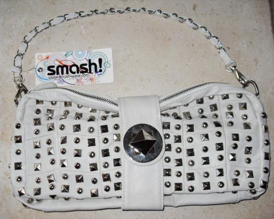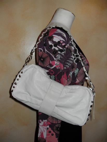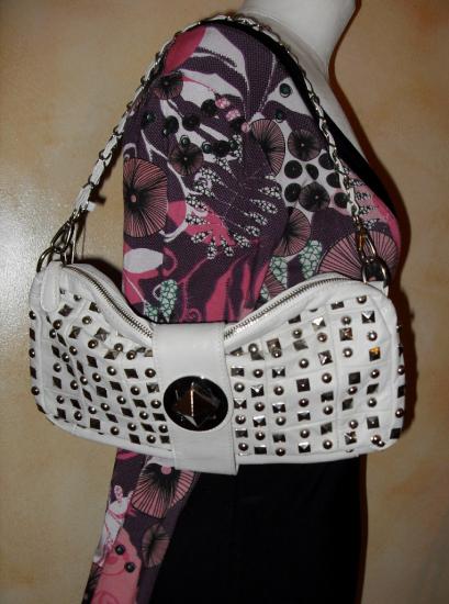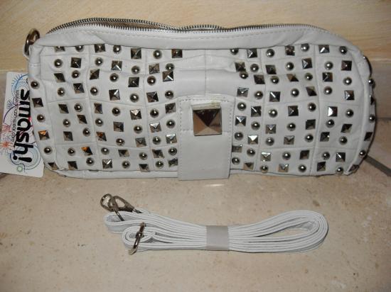 Sac à main imitation cuir écru et clouté. Fermoir sur le devant et fermeture sur le dessus.