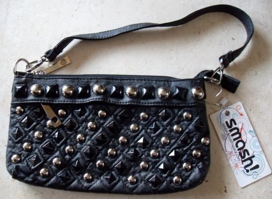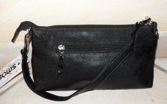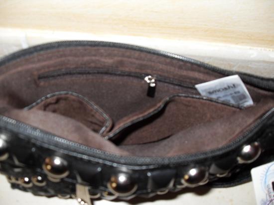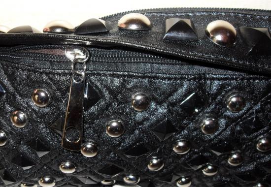 Sac à main imitation cuir noir, cabochons noirs et clous. Poche zippée sur le devant et dans le dos, fermeture éclair sur le dessus.