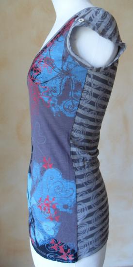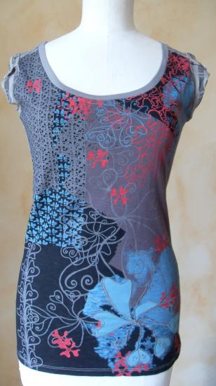 Tee-shirt gris avec motifs noir, turquoise et rose. Manches courtes avec un petit bouton en décoration.