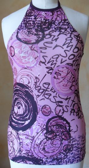 Top noué autour du cou, dans les tons de mauve, rose et violet.