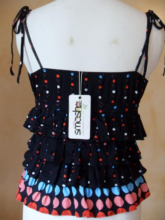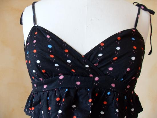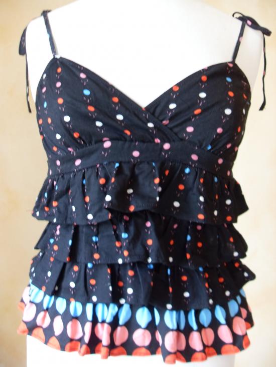 Top noir et pois muticouleurs, haut forme cache-coeur, avec bretelles-liens à nouer. Hauteur : 55cm environ.