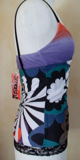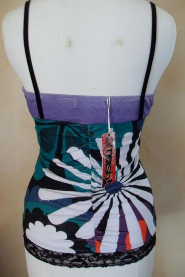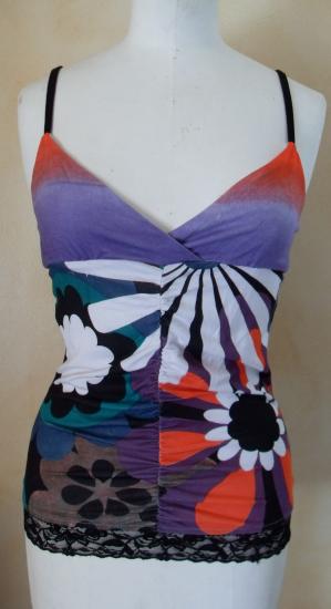 Top imprimé avec dentelle noire sur le bas, fines bretelles noires, haut cache coeur.