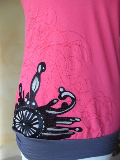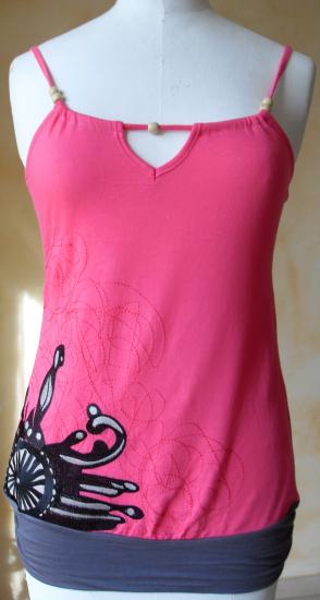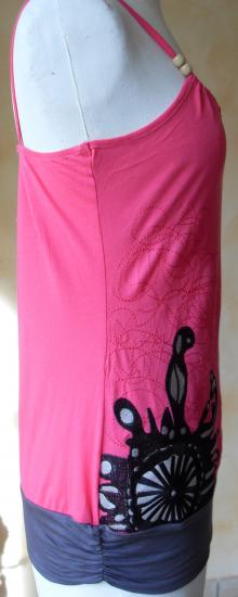 Débardeur rose fushia avec motif et broderie, fines bretelles avec perles de bois. En bas, empiècement gris.