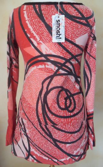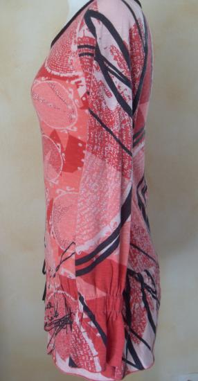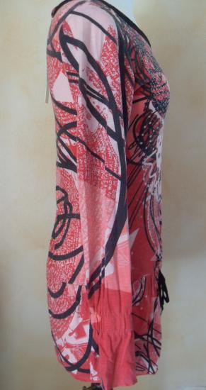 Tunique imprimée dans les tons de rose et noire, manches longues resserrée sur le poignet.