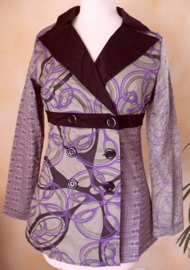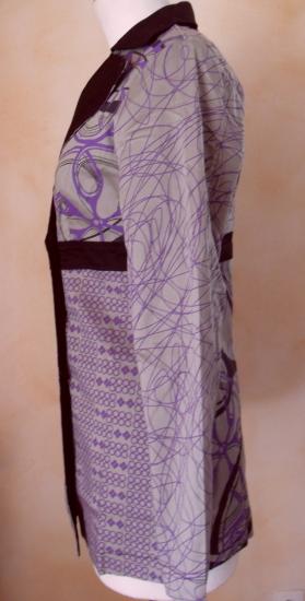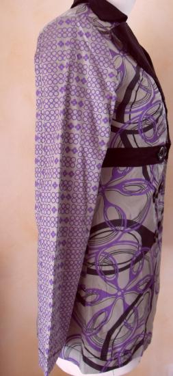 Veste longue grise et imprimé violet. Col tailleur et boutonnée devant, doublure noire.