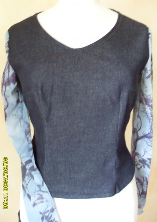 Bustier en jean's elasthanne, couleur brut avec manches longues en voile lycra bleu ciel imprimé violet.