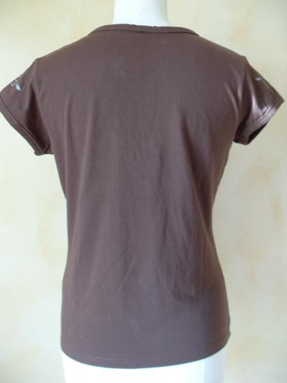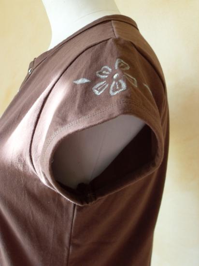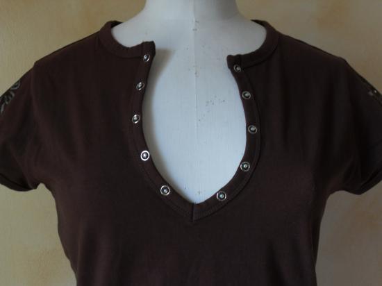 Tee-shirt marron, décolleté en v avec pressions et strass. Fleurs argentées et strass sur le côté et sur les manches.