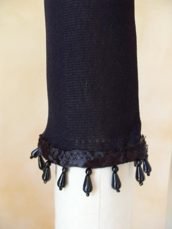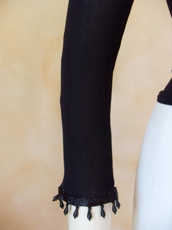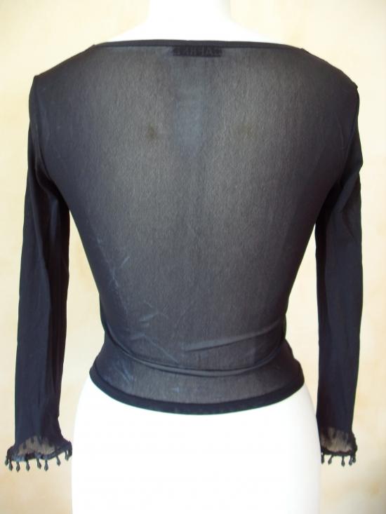 Haut en voile lycra noir, manches longues avec ruban et perles sur tout le tour du poignet. Double épaisseur de voile sur le devant du haut.