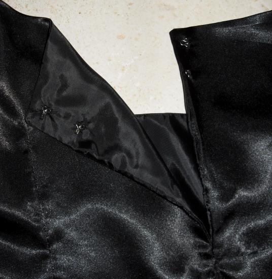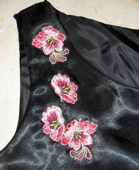 Robe satinée noire avec application de fleurs brodées sur la bretelle, décolleté arrondi.Fermée dans le dos par deux agraphes.