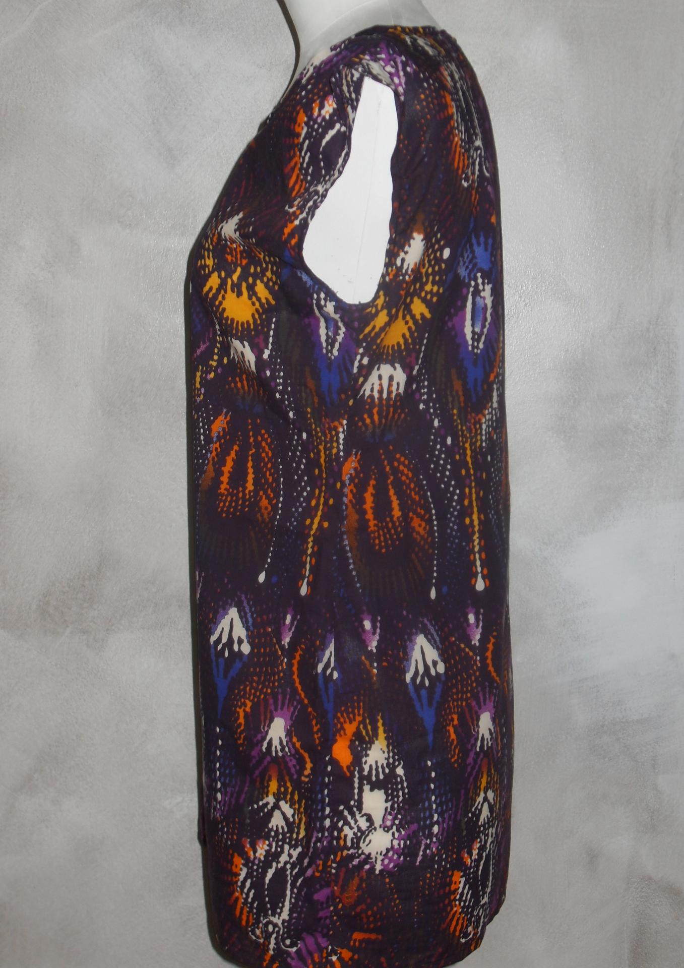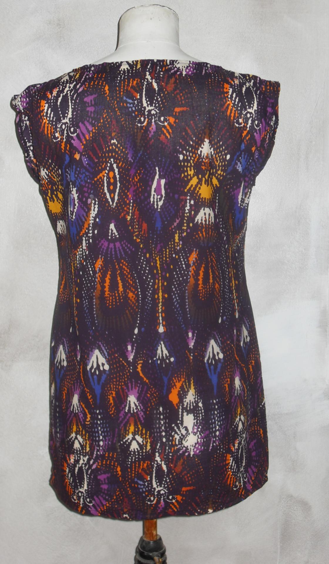 Robe- Tunique courte imprimée orange et violet, sans manches avec plis et col arrondi.